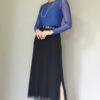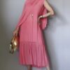 Vestido de tule cor pêssego, decote V com mangas tipo japonesa, corte evasê, maria com fenda na frente e todo forrado. Acompanha echarpe.
