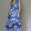 Vestido de tule estampado, decote V com mangas tipo japonesa, corte evasê, maria com fenda na frente e todo forrado.
