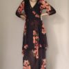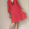 Vestido de tule cor amarelo, evasê, estilo boho com detalhe franzido na parte da saia, decote V e manga 3/4 com acabamento flare. Com forro.