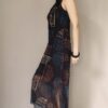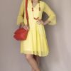 Vestido de tule cor laranja, evasê, estilo boho com detalhe franzido na parte da saia, decote V e manga 3/4 com acabamento flare. Com forro.