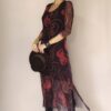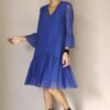 Vestido de tule cor marsala, evasê, estilo boho com detalhe franzido na parte da saia, decote V e manga 3/4 com acabamento flare. Com forro.