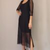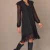 Vestido de tule cor preto, evasê, estilo boho com detalhe franzido na parte da saia, decote V e manga 3/4 com acabamento flare. Com forro.