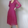 Vestido de tule cor pitaya, ajustado até a cintura, saia evasê assimétrica, mangas longas ajustadas, decote alto com franzido. Com forro.