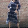Vestido de tule estampado com manga longa, decote V e a parte da saia godê com bicos e recortes. Com forro.