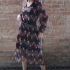 Vestido de tule estampado com manga longa, decote V e a parte da saia godê com bicos e recortes. Com forro.