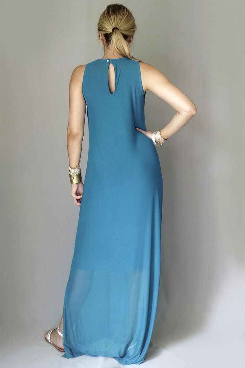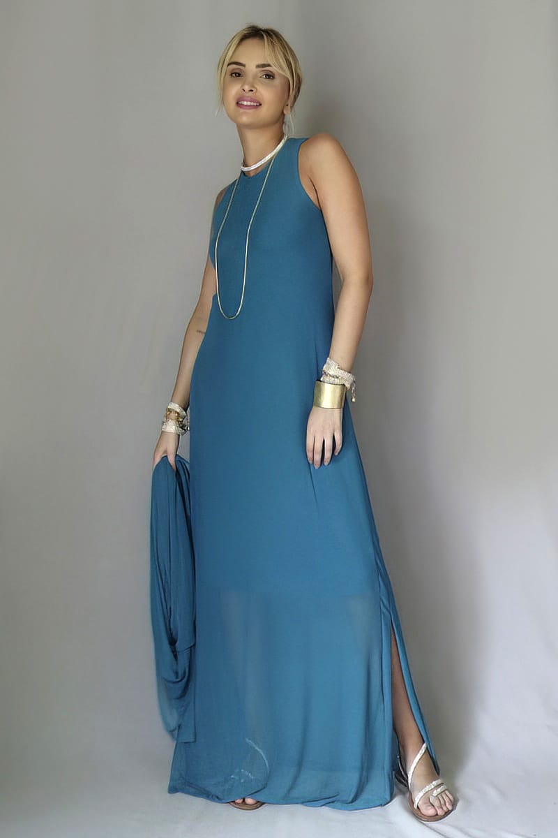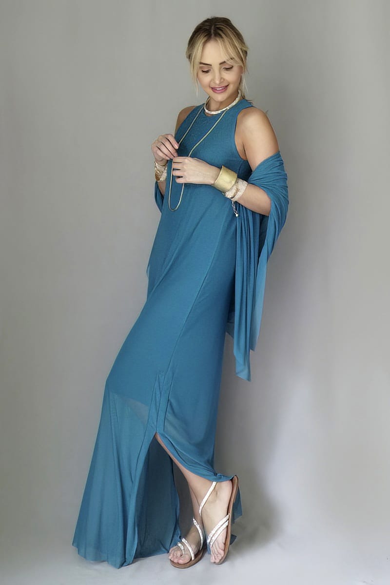 Vestido de tule longo, cor azul petroleo, sem mangas, com fendas laterais, acompanhado de echarpe. Com forro.