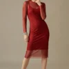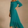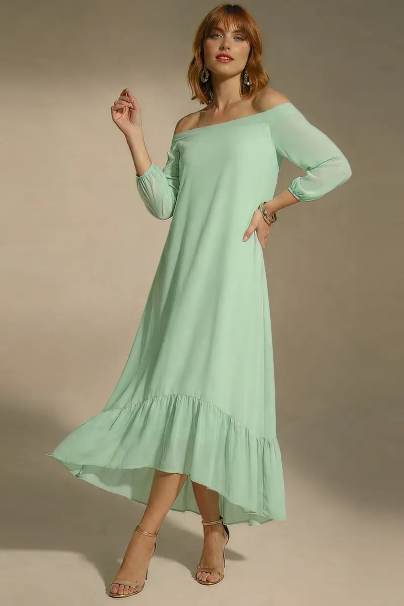 Vestido de tule cor verde menta com modelagem mullet, ombro a ombro e manga bufante 3/4. Com forro.