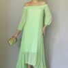 Vestido de tule cor azul petroleo com modelagem mullet, ombro a ombro e manga bufante 3/4. Com forro.