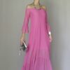 Vestido longo cor verde, ombro a ombro, mangas comprimento 3/4, corte evasê e com Maria na barra. Com forro.