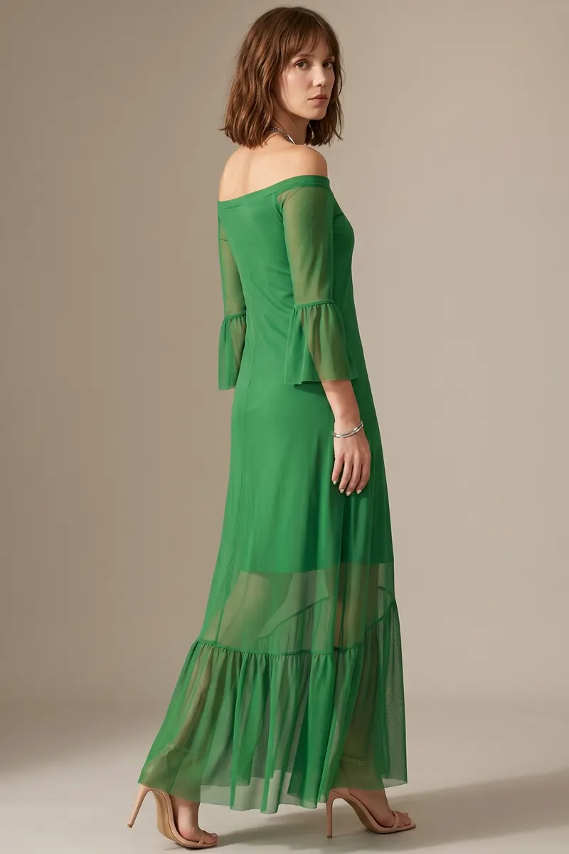 Vestido longo cor verde, ombro a ombro, mangas comprimento 3/4, corte evasê e com Maria na barra. Com forro.