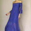 Vestido longo cor vermelho, ombro a ombro, mangas comprimento 3/4, corte evasê e com Maria na barra. Com forro.