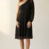 Vestido longo cor vermelho, ombro a ombro, mangas comprimento 3/4, corte evasê e com Maria na barra. Com forro.
