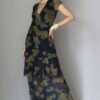Vestido de tule cor preto, comprimento longo, um ombro, sem mangas, decote com babado godê, modelagem com cortes verticais e nesgas. Com forro.