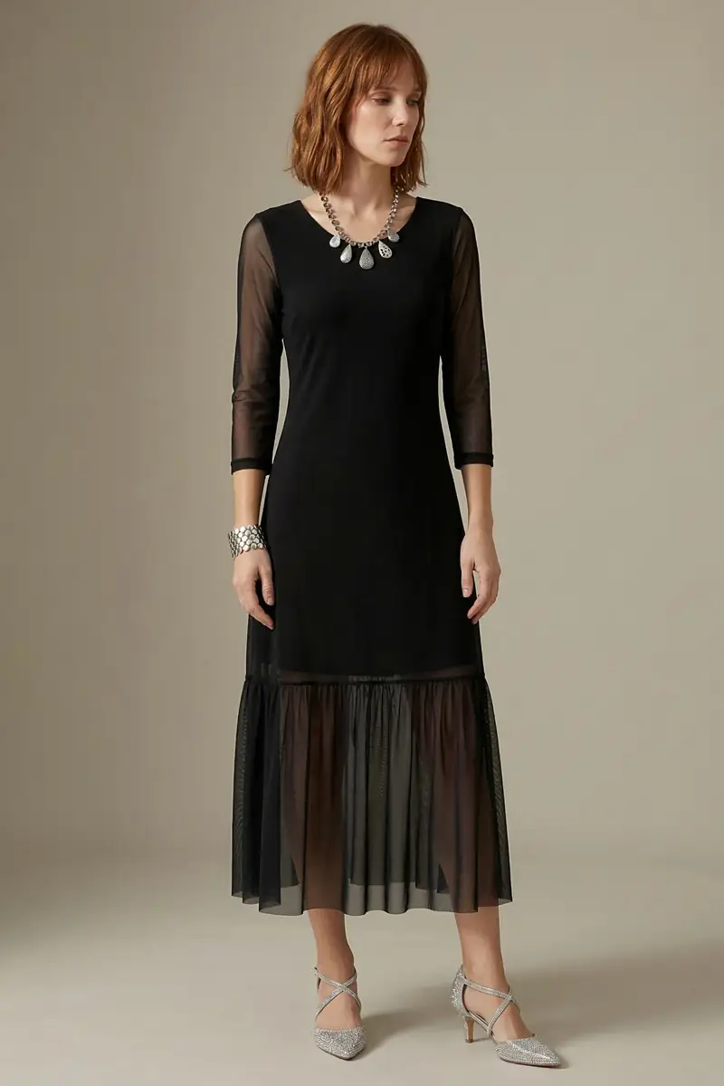 Vestido de tule cor com manga 3/4, decote redondo, corte evasê e barrado franzido. Com forro