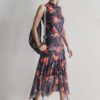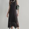 Vestido de tule com gola levemente alta e babado em duas camadas.