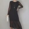 Vestido de tule com gola levemente alta e babado em duas camadas.
