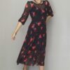 Vestido de tule cor vermelho com gola levemente alta, manga cavada, ajustado até o quadril e saia godê com pontas. Com forro.