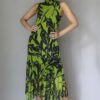 Vestido de tule estampado com gola levemente alta, manga cavada, ajustado até o quadril e saia godê com pontas. Com forro.