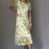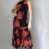 Vestido de tule estampado com gola levemente alta, manga cavada, ajustado até o quadril e saia godê com pontas. Com forro.