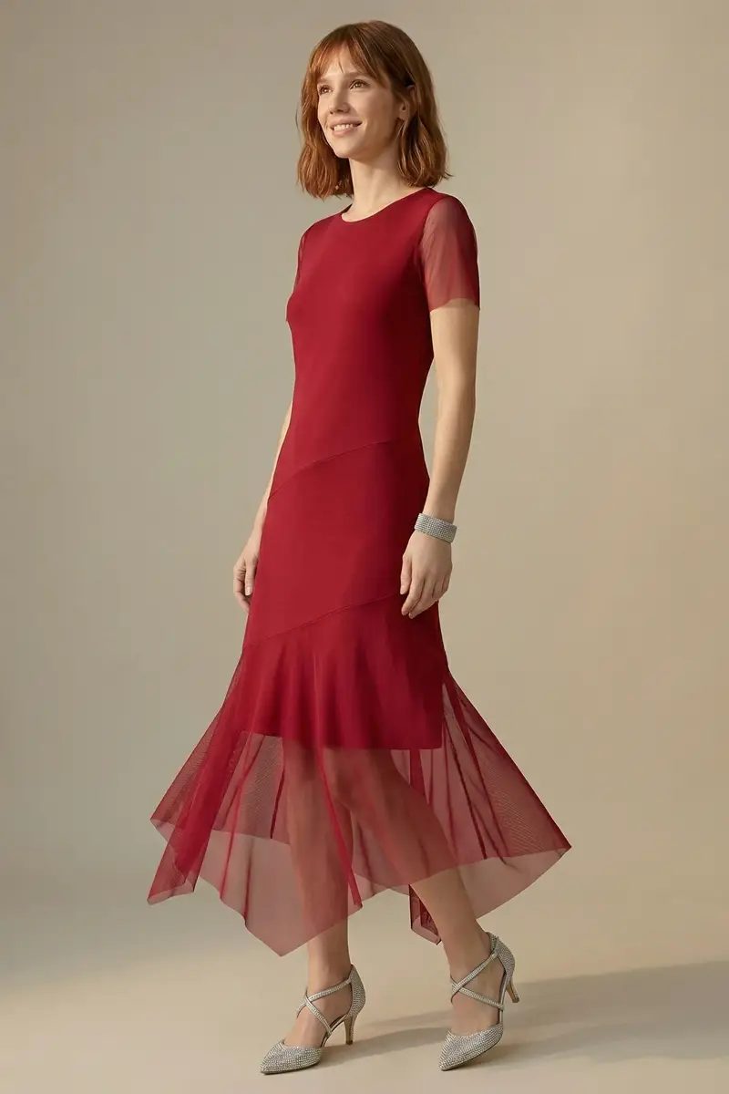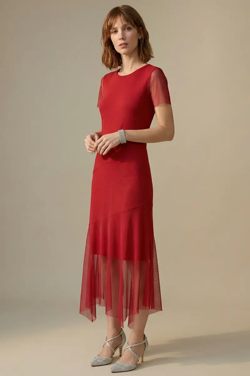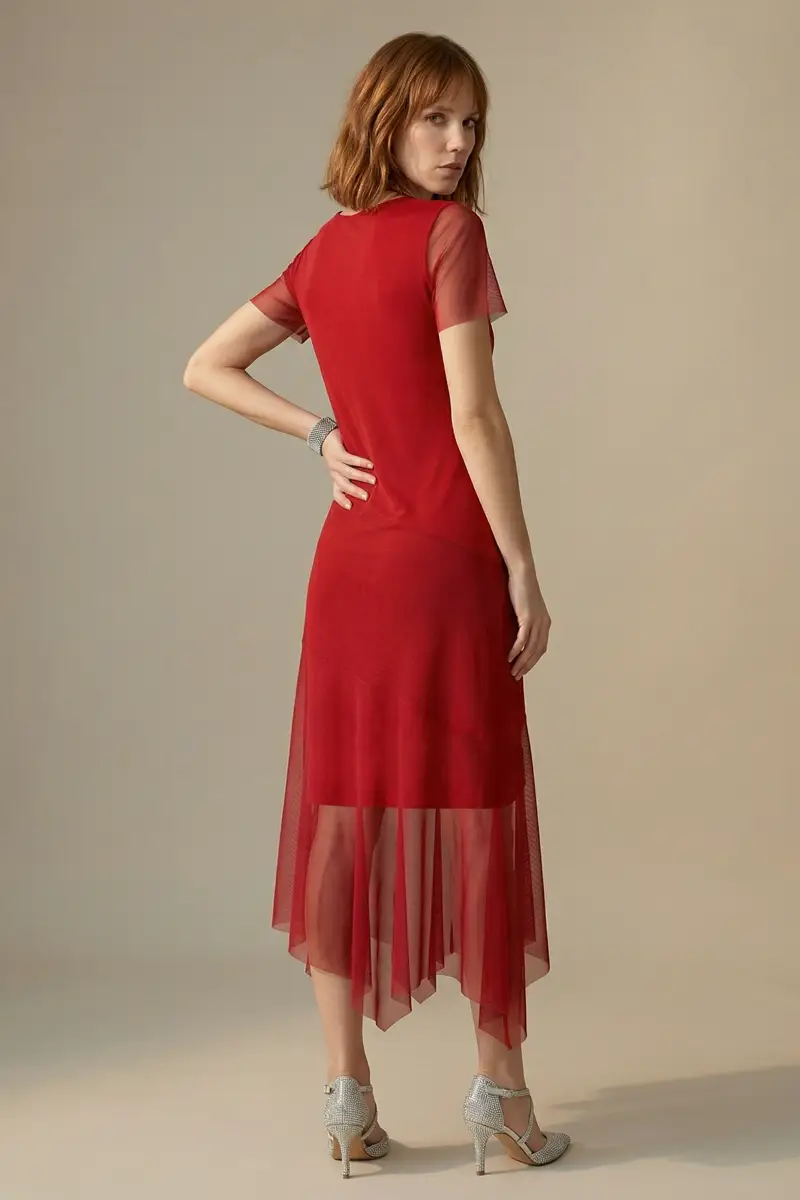 Vestido de tule cor vermelho manga curta, ajustado ao corpo com comprimento midi e recortes assimétricos. Com forro.